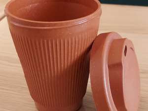 Reusable, dishwasher safe, practically unbreakable cup made with recycled coffee grounds and beech wood scraps.